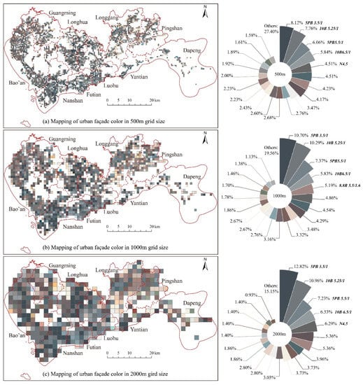 As shown in Figure 9, the dark-gray color (Munsell code: 5PB 3.5/1) is the urban façade color with the largest proportion in all three grid sizes. In the grid-scale of 500 m (Figure 9a), the urban façade color of Shenzhen is a gray tone, together with some bright and high chroma tones such as red, blue, and green. The bright colors are the various façade colors of some hotels or commercial buildings. Some commercial buildings have adopted intense and jumping colors, which are in sharp contrast with office buildings. As the grid size increases, the detailed color information in small unit sizes is integrated.