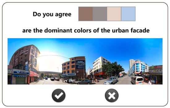 The performance of the extraction method of the urban façade color was evaluated with the expert scoring method. A C# software for result verification was developed for experts to determine whether the extracted four dominant colors with the largest DCUF weight represent the dominant color of urban façade based on the BSV panorama of the site. Figure 10 shows the user interface of the C# software to collect feedback from experts.