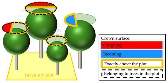 Illustration of the crown surface fractions. The plot area is indicated by the yellow square. The transparent green circles above the trees indicate the crown projection areas. The coloring marks the outgoing (red) and incoming (blue) parts of the crowns, as well as the crown surface exactly above the plot (orange border) and the crown surface belonging to trees in the plot (black dashed border).