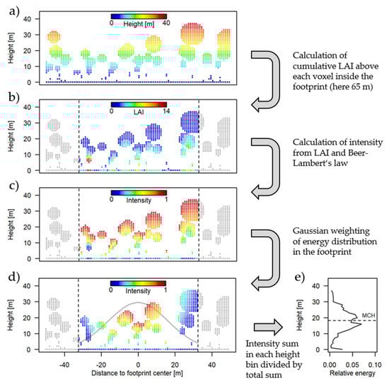 Light extinction was modelled using Beer–Lambert’s law, with e being the base of the natural logarithm. The light extinction coefficient k was set to 0.2 []. LAI is the leaf area index above the voxel, calculated as the sum of the leaf area densities of all of the voxels lying directly above (same X and Y coordinate). The Gaussian energy distribution was modelled by the quotient term in the exponent of Equation (6), where d is the distance of the voxel to the footprint center in the XY-plane, and SD is the standard deviation of the Gaussian distribution, which was set to 0.5 times the footprint radius []. The reflectance of the forest ground voxels was down-weighted by dividing by 2.5 in order to account for the lower reflectivity of the ground vs. vegetation []. The reflected intensities of all of the voxels in each 1-m height layer were summed up and the waveforms were standardized to have a total sum of one (Figure 2).