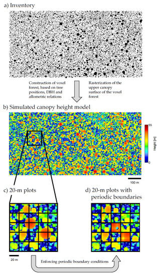 A subset of the data table was stored representing only the upper surfaces of the tree crowns which are visible from above (i.e., the voxel with the maximal Z value for each unique combination of X and Y). Raster representations of the upper canopy surface are commonly called canopy height models (CHM). They can be derived from lidar point clouds, photogrammetry, or radar. CHMs from airborne lidar are commonly derived with a simple point-to-raster method for dense point clouds, or via interpolation methods for less dense point clouds []. Hence, rasterizing the maximal Z value for each unique X and Y combination in our 3D voxel space leads to a simulated CHM of 1-m resolution, which is entirely based on the inventory data and allometric relationships. Because, for the simulated lidar, there is no geolocation error with respect to the inventory, the pure border effect can be studied.