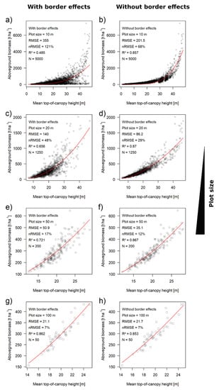 Height–biomass relationship for square-shaped plots of different sizes. The scatterplots show the aboveground biomass (AGB) plotted over the mean top-of-canopy height (TCH derived from simulated canopy height models). The red lines represent the best-fitting regression models. The left-hand side shows the normal conditions with border effects (a,c,e,g). The right-hand side shows the relationships derived from the data with the border effects switched off, using periodic boundaries (b,d,f,h).