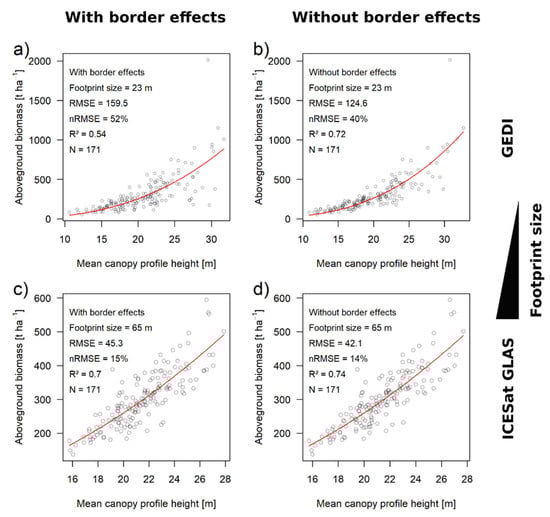 Height–biomass relationship for large lidar footprints. The scatterplots show the aboveground biomass (AGB) plotted over the mean canopy profile height (MCH derived from waveform simulations) at the footprint sizes of the GEDI (a,b) and ICESat GLAS (c,d) sensor systems. The red lines represent the best-fitting regression models. The left-hand side shows the normal conditions with border effects (a,c). The right-hand side shows the relationships derived from the data with the border effects switched off, using periodic boundaries (b,d).
