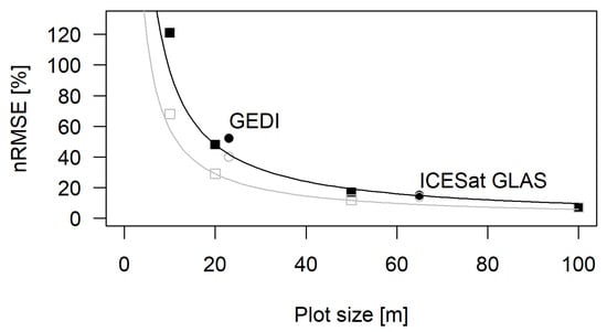 Summary of the ways in which the normalized root mean square error (nRMSE) scales for biomass estimations from CHM (squares) and large-footprint waveforms (circles) with border effects (black filled) and without border effects (grey open). The curves represent the theoretical scaling behavior according to which the errors decline by (plot area)−1/2 or (plot side length)−1 []. The curves were drawn to match the nRMSE at the 20-m scale exactly, and they approximate the observed nRMSE at the other scales well.