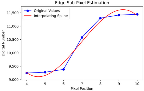 Example of sub-pixel location estimation for a single edge: original DN values (blue line) and cubic spline fit (red line).
