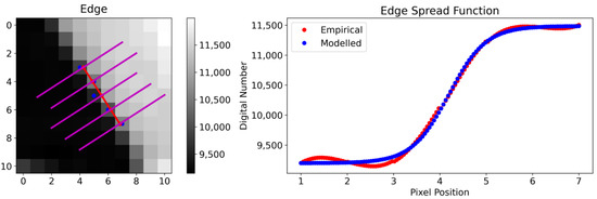 Estimating the exact edge location with sub-pixel precision is fundamental to reconstruct precisely the edge profile. This step is performed on the edges that meet all the geometric and statistic eligibility criteria. For each edge, a grid containing the corresponding bright and dark areas located contiguously to the edge is initially defined. The dimension of the bright and dark grid containing the edge varies according to the edge length. More precisely, the grid is centered on the edge and has a square shape. The sides of the grid have a length equal to one of the edges, plus six pixels. The additional six pixels are needed to sample three pixels on either side of the edge in order to account for all the possible edge positions and orientation inside the grid. Subsequently, the sub-pixel edge position is found by fitting the “original” edge position with a cubic polynomial function, as shown in Figure 3 for a single edge pixel: in addition to the DN of the edge pixel itself, the three abovementioned additional pixels are sampled on both sides of the edge. These seven values are then fitted using a cubic spline function. Once the equation of the cubic spline is known, the position of the sub-pixel edge is then assumed to correspond to the zero-crossing of the second derivative of the fitting function. This process is repeated for each row or column of the grid that contains an edge pixel. Finally, after finding all the refined edge positions in the grid, these new coordinates are fitted linearly to obtain the equation of the edge line (assuming the edge has a linear shape). Once the (linear) equation of the sub-pixel edge is estimated, its exact inclination is computed, and the edge is classified as: “along-track”, “across-track”, or “all inclinations” according to predefined criteria (i.e., ranges of degree). The definition of the range of inclinations that discriminates between along- and across-track edges is important in order to guarantee coherence among these definitions when comparing results of different analyses specifically carried out to perform a sharpness assessment in a specific direction. As such, if needed, this parameter can be defined by the operator.