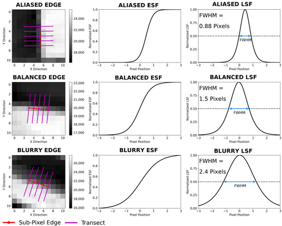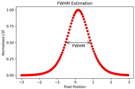 An important metric that can be used to quantify the sharpness level of an image acquired by optical sensors via the EM is the FWHM of the normalized LSF (hereinafter, the term FWHM will be referred to this parameter) [9,12,14,16,18]. The latter is calculated by measuring the width of the normalized LSF at a value of 0.5, as shown in Figure 1 [9,14,16,18]. Therefore, smaller values of FWHM correspond to steeper slopes of LSFs, which in turn are associated to sharper images [16]. The FWHM value is expressed in pixels, and it can then be translated to metric units by taking into account the image PS. Consequently, it can also be used to quantify the effective spatial resolution of the images [9,14,16,19]. Indeed, and as previously anticipated, the FWHM is also considered de facto a standard metric for the spatial resolution of digital images [9].