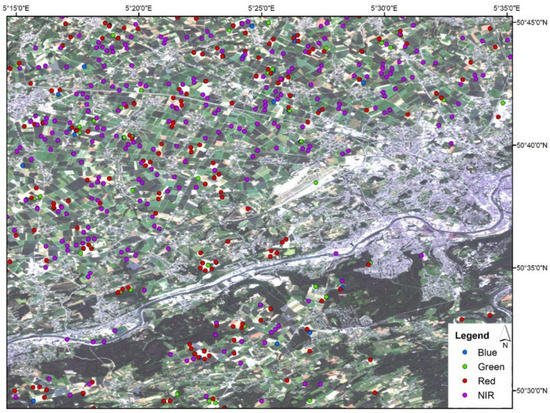 Another consideration that can be made by observing Figure 8, which, as previously explained, is considered as an exemplifying image representative of the SaSbEM results, is that the number of edges that were detected by the algorithm depends on the spectral band used for the analysis. In fact, the number of eligible edges found by the algorithm increases as the bands’ wavelength increases. Consequently, the higher number of eligible edges was found first in the NIR band, then in the red band. A lower number of eligible edges was instead found in the green and, finally, in the blue bands. This is due to the fact that, according to a radiometric point of view, in the target areas of the algorithm, the NIR and the red bands are more contrasted than in the green and the blue bands (probably due to a combination of atmospheric effect and natural surface spectral reflectance characteristics) [42]. Moreover, possible atmospheric effects (e.g., scattering) are more likely to affect bands acquiring data in the blue (and green) bands.