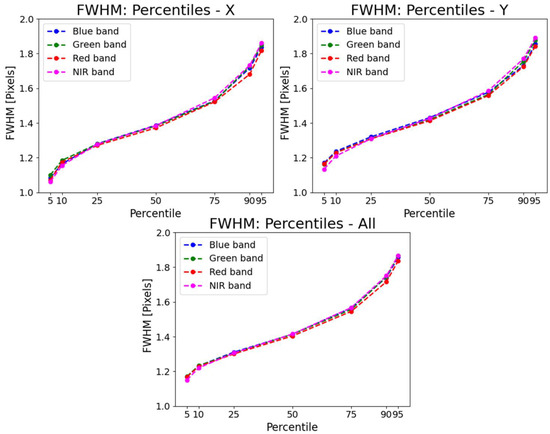 In the figure are shown the different percentile of FWHM values obtained from the L1T analysis. The data are displayed for all the spectral bands and for all the categories of sampling direction: “X”, “Y”, and “All”.