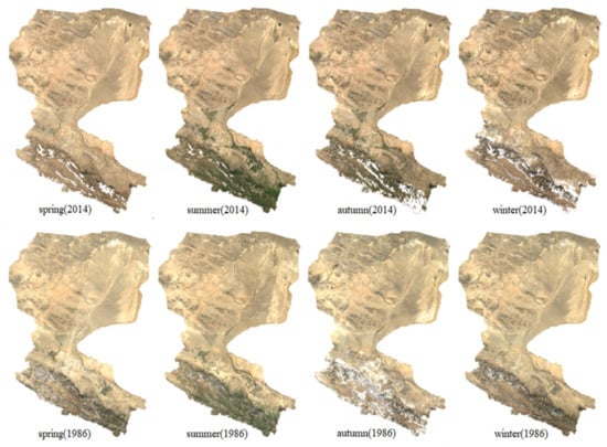 - Due to the inconsistency of seasonal surface reflectance composites in Figure 2, the samples from step 2 could only satisfy the requirement for 2011–2015 and could not be directly transferred for application at earlier years; therefore, a strategy for transferring the training samples to earlier years was established. The details of the strategy are presented in Section 2.4.3.