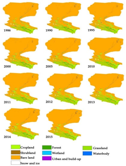 - Due to its advantages (detailed in Section 2.4.4.), the random forest model was employed to train the selected yearly samples and the land cover map for every year was subsequently made. A long time series land cover dataset including 1986, 1990, 1995, 2000, 2005, 2010, 2011, 2013, 2014, and 2015 was made.