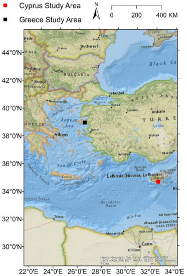 The Sentinel-2 remote sensing data were obtained from the Copernicus database at two locations (Limassol, Cyprus and Mytilene, Greece) where in situ data on plastic pollution were available. The remote sensing used for the analysis needed to be processed to perform atmospheric corrections before developing classification models. Details on the data, atmospheric correction, and in situ data description are provided below.