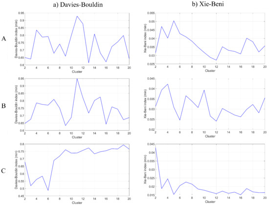 The (a) Davies–Bouldin cluster validity index and (b) Xie–Beni cluster validity index obtained by using attribute sets (A–C) defined in Table 3 to identify optimal cluster numbers using the K-means and fuzzy c-means algorithms, respectively. The horizontal axis shows the number of formed clusters, while the vertical axis provides the value of the cluster validity measures.
