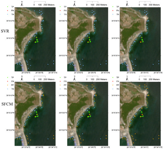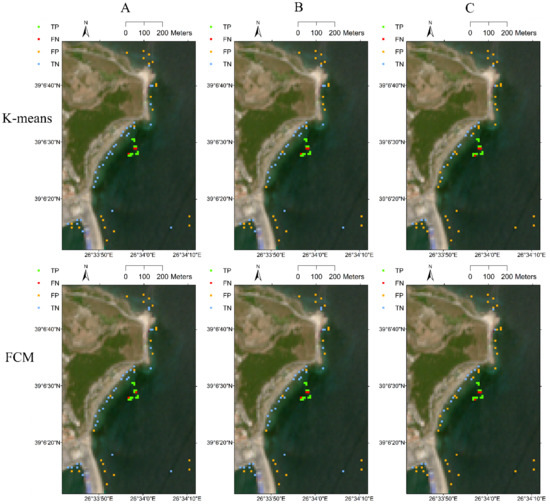 Similar plots were prepared based on classifications obtained using K-means, FCM, SVR and SFCM based classification algorithms and by using each of the three attribute sets A, B, and C (Figure 5). In this figure, grids were plotted as true positive (TP) where the model correctly detected the floating plastics, true negative (TN) where the model correctly predicted the absence of floating plastics, false positive (FP) where the model wrongly predicted the presence of floating plastics, and false negative (FN) where the model failed to detect floating plastics. The figure is useful for locating the correctly classified and misclassified grids from the validation set.