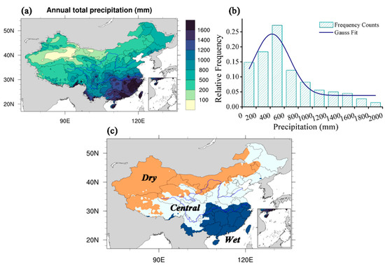Spatial distribution of the annual accumulated precipitation (in mm) from 2001 to 2019 in China (a) and the frequency distribution histogram of the multiyear average annual accumulated precipitation (in mm) (b). Three subregion divisions according to the annual precipitation (c).