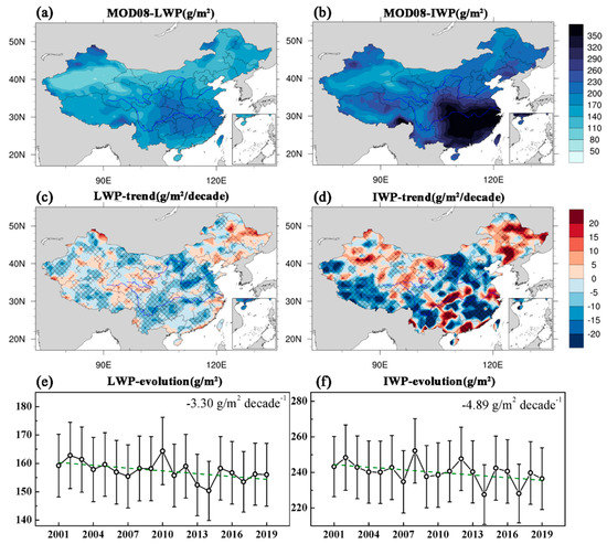 Spatial distribution of the annual liquid water path (LWP) and ice water path (IWP) (in mm) from 2001 to 2019 in China (a,b) and its Mann–Kendall (MK) trend distribution (c,d). The blue contour color indicates a negative value, and red indicates a positive value. The grid line shading in the figure indicates the area that passed the 95% significance trend test. The national average evolution of LWP and IWP (e,f); the values in the top right corner indicate the linear fitting slopes.