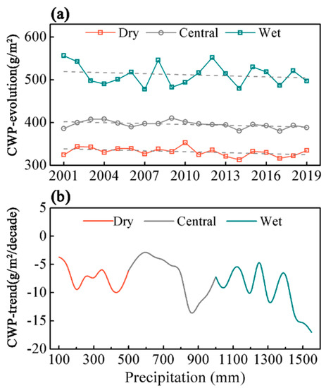 Figure 3a shows the evolution of the cloud water path (sum of liquid water path and ice water path) in the three subregions from 2001–2019. The cloud water path is the highest in the wet region, reaching approximately 500 g/m2. The cloud water path in the central and dry regions decreases in that order, and the cloud water path in the central region exhibits the most stable change trend at approximately 400 g/m2. The cloud water path in all three regions decreases year by year. To compare the specific decreasing trends, Figure 3b shows the variation in the MK trend of the cloud water path with the annual precipitation in China. The trend of the cloud water path decreases in all precipitation intervals, which is consistent with the linear fitting results. The decreasing trend of the cloud water path gradually increases with increasing annual precipitation. The decreasing trend in the arid areas varies between −5 and −10 g/m2/decade, and the decreasing trend is the lowest in the interval with an annual precipitation of 600 mm. The trend of the cloud water path rapidly decreases with increasing precipitation. This indicates that under global warming, the cloud water path in China decreases year by year, and the wetter areas with higher precipitation yield the greatest contribution and the most obvious reduction trend. The slowest decrease in the cloud water path is observed in the semiarid regions with a precipitation ranging from 500–800 mm. The decreasing trend obtained here does not conflict with Liu, et al. [14], since they mainly analyzed the arid and semiarid region in Central and East Asia from 1982 to 2015, while the cloud water high value area is mainly located in south-eastern China. The significant decrease in the cloud water path observed over the past two decades certainly affects the local precipitation conditions, as the cloud water path in the atmosphere is a direct source of precipitation.