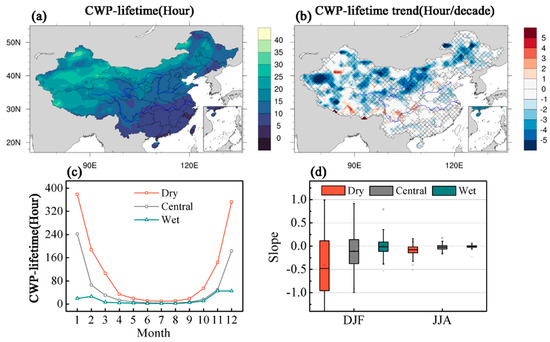 Spatial distribution of the annual cloud-water period (in hours) and its MK trend from 2001 to 2019 in China (a) and its MK trend distribution (b). The blue contour color indicates a negative value, and red indicates a positive value. The grid line shading in the figure indicates the area that passed the 95% significance trend test. Seasonal evolution of the cloud-water period in the three subregions (c). Box chart of the cloud-water period trend in the three regions in winter and summer (d).
