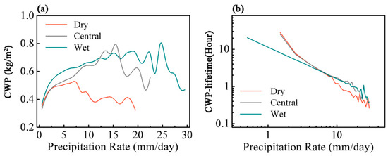 The variation in the cloud-water period with the UMF in the different regions is shown in Figure 6a, with the upward flux uniformly divided into 40 intervals. The overall cloud-water period is negatively correlated with the UMF, and the cloud-water period rapidly decreases in all three regions with increasing upward flux. This occurs because the stronger the upward vertical transport process, the more likely precipitation is formed. However, a high vertical velocity or intense convective activity does not necessarily indicate high precipitation [42,43]. The cloud-water period does not decrease linearly with increasing upward flux, and the cloud-water period hardly further decreases when the UMF increases to a certain level. In the dry region, the cloud-water period stops decreasing when the UMF is higher than 100 g/m2/h and even starts increasing rapidly when the UMF is higher than 150 g/m2/h. In fact, when UMF greater than 200 g/m2/h, the cloud-water period in all regions increased with UMF. The increase of the dry curve is simply earlier than in other regions, corresponding to the minimum peak precipitation intensity in the dry region in Figure 5. This further indicates that the UMF is not the only factor that determines the cloud-water period.