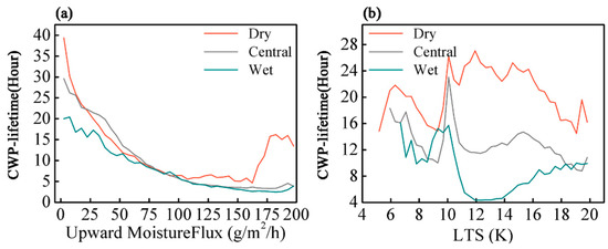 Additionally, as shown in Figure 6b, in regard to the variation in the cloud-water period with the LTS in the different regions, the LTS is uniformly divided into 40 intervals. In contrast to the UMF, the variation in the cloud-water period with the LTS is very different in the three regions. The first peak of the cloud-water period occurs near an LTS value of 6 K, and the cloud-water period first gradually decreases with increasing LTS and then increases rapidly. The second peak is reached near LTS = 10 K, after which the cloud-water period in the three regions exhibits different trends. At high LTS values (>12 K), the response of the cloud-water period to the LTS is completely the opposite between the dry and wet regions. If we ignore the LTS fluctuation between 8 and 10, the cloud-water period increases and then decreases with the LTS in the dry region, while it decreases and then increases in the wet region. This opposite response inevitably causes different evolution patterns of cloud precipitation in the dry and wet regions. However, this does not indicate that the difference in cloud-water evolution between these two regions is entirely a function of the thermal contribution. He [46] suggested a positive relationship with surface moisture flux for low LTS and a negative relationship for high LTS, which is mainly related to near-surface wind speed and evaporation. We conjecture that in dry region with low moisture flux, increased LTS promotes moisture flux exchange, while in wet region with high moisture flux, increased LTS inhibits moisture flux exchange.