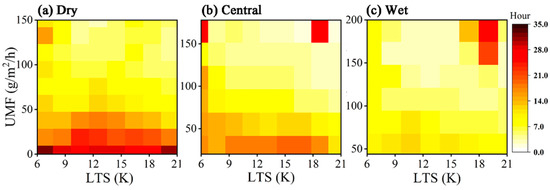 Joint probability density distribution of the cloud-water period with the UMF and LTS in the dry (a), central (b), and wet regions (c). The color shaded area denotes the cloud-water period (in hours) averaged over each cell.
