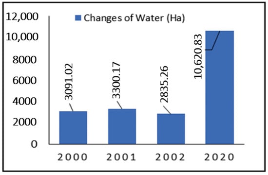 Previous studies proved that the storage capacity of the Erlong Lake tank witnessed a remarkable deterioration, especially in the period from 2000 to 2003. The storage capacity was about 2 × 108 m3, less than the normal limit for storage (2.36 × 108 m3). This is due to the dams that blocked the incoming water into the lake, leaving only the Dongliao River from Liaoyuan City and Dongliao County. In addition, it carries industrial wastewater and domestic sewage to the lake. In 2020, the average capacity was 223.42 million cubic meters. In this study, Landsat images were used to confirm the changes in water level in the lake and found that the lowest area of the water column was in 2002 (2835.220331 ha) (Figure 2), and the highest value of the water column was in 2020 (10,620.82961 ha). This can be explained as being due to the excess amount of rainfall in 2020.