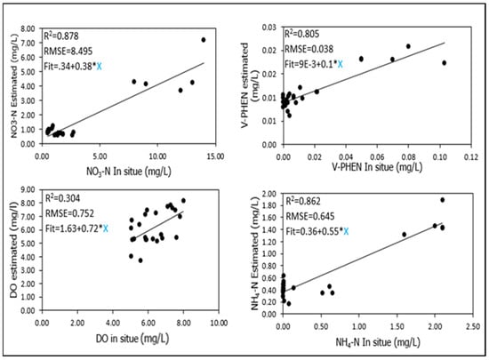 The developed relational equations of the Landsat reflectance value and the water quality parameters were determined mathematically using regression analysis. Table 3 shows the results of regression analysis for calibration and validation. In calibration (Table 3 and Figure 3), the V-phenol, NH4-N, NO3-N, and DO indicated significant positive correlations (R2 = 0.805, 0.862, 0.878, and 0.304, respectively) with mathematical equations obtained from Landsat selected data. Meanwhile, RMSE values were 0.038, 0.645, 8.495, and 0.752, where p-value was less than 0.001.