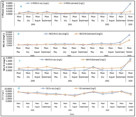For DO (Table 4 and Figure 4d), the highest average concentration on 15 May 2000 was 7.4850 mg/L, and from the model, it was 7.4090 mg/L. In 2001, DO showed the highest in situ average on 15 September (6.1450 mg/L) compared with that of the model in the same month (6.3393 mg/L). In 2002, the highest average DO on 15 September was 7.9100 mg/L, compared with the average from the model (7.5570 mg/L), as well as on 19 October 2020, where the average concentration of DO was 6.1000 mg/L, compared with the average from the model (5.2707 mg/L).