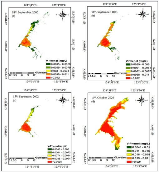Spatial distributions of V-phenol ((a) spatial distributions of V-phenol on 18 September 2000, (b) spatial distributions of V-phenol on 16 September 2001, (c) spatial distributions of V-phenol on 15 September 2002, (d) spatial distribution of V-phenol on 19 October 2020), estimated via models generated from Landsat (TM, ETM, and OLI8) in Erlong Lake.
