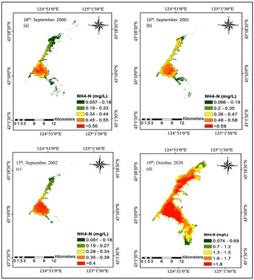 Spatial distributions of NH4-N ((a) spatial distributions of NH4-N on 18 September 2000, (b) spatial distributions of NH4-N on 16 September 2001, (c) spatial distributions of NH4-N 15 September 2002, (d) spatial distributions of NH4-N on19 October 2020), estimated via models generated from Landsat (TM, ETM, and OLI8) in Erlong Lake.