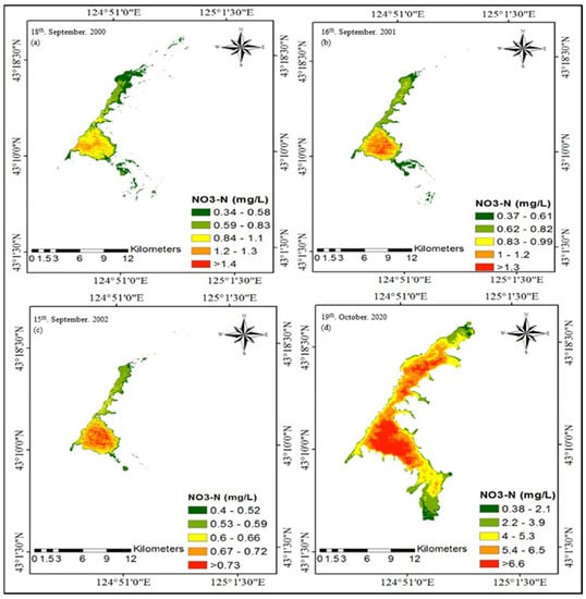 Spatial distributions of NO3-N ((a) spatial distributions of NO3-N on 18 September 2000, (b) spatial distributions of NO3-N on 16 September 2001, (c) spatial distributions of NO3-N on 15 September 2002, (d) spatial distributions of NO3-N on 19 October 2020), estimated via models generated from Landsat (TM, ETM, and OLI8) in Erlong Lake.