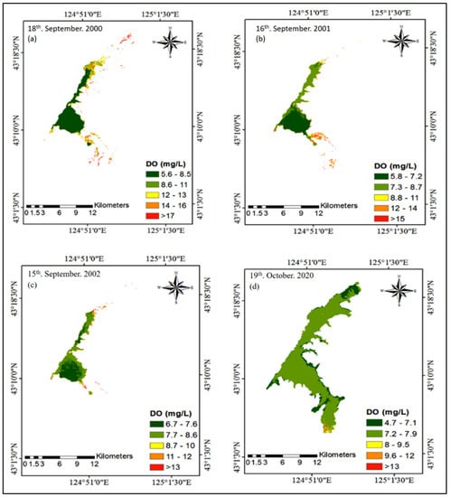 Spatial distributions of dissolved oxygen ((a) spatial distributions of DO on 18 September 2000, (b) spatial distributions of DO on 16 September 2001, (c) spatial distributions of DO on 15 September 2002, (d) spatial distributions of DO on 19 October 2020), estimated via models generated from Landsat (TM, ETM, and OLI8) in Erlong Lake.