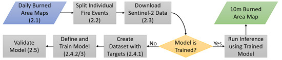 Pipeline to generate the 10 m resolution burned areas. Numbers in parenthesis indicate the paper’s subsection describing the process.