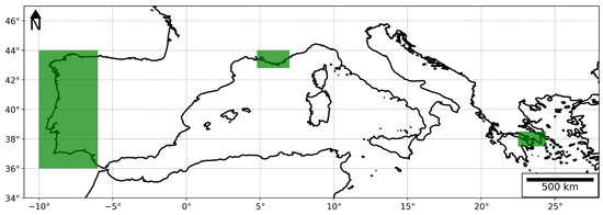 Green rectangles delimit the regions of study described in Table 1.