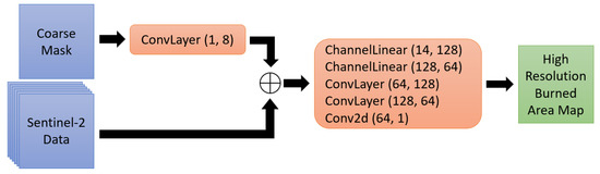 The Coarse Mask in Figure 3 is the BA-Net [13] burned area map interpolated to the same projection and spatial resolution as the Sentinel-2 data and after applying a spatial moving average filter with kernel size of pixels (about km) to soften the edges of the coarse mask. The output of the ConvLayer (small orange box in Figure 3) is then concatenated with the 6 input channels of the high-resolution data, corresponding to the Red, NIR and SWIR before and after the fire. The resulting tensor has a size of [batch-size, 14, 512, 512], where the batch-size is constrained by the GPU memory as will be covered in the next subsection. The layers in the large orange block in Figure 3 are then applied sequentially resulting in the high resolution burned area as output, a tensor with size [batch-size, 1, 512, 512].