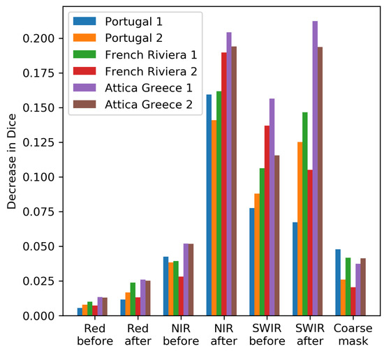 To better understand the results and the trained model we computed the relative importance of each input band to the final result (Figure 4). The relative importance was measured as the decrease in Dice score of the output when the input band in x-axis was randomly shuffled compared to the score when the unchanged input data were used. When shuffling the data, water pixels were masked out to avoid mixing land and water pixels. We can see that, in general, the NIR and SWIR were the most important features (Figure 4), particularly, the post-fire NIR and SWIR followed by the pre-fire SWIR. The pre-fire NIR and coarse mask followed with a small importance variation among the six case studies, and finally the least important feature was the red, particularly the pre-fire red. Looking in more detail at the three dominant features (post-fire SWIR and NIR and pre-fire SWIR), there were noticeable differences among the case studies. For example, while for the “Portugal 1” case the post-fire NIR was the most important feature, for the “Attica Greece 1” case, the post-fire SWIR and NIR showed the highest importance, followed by the pre-fire SWIR. There are several factors that could explain these differences. For example, a fire occurring earlier in a fire season, as is the case for “Portugal 1” event, is more likely to show a stronger drop in NIR as the vegetation is usually not as dry as later in the season. It is also worth noting that our feature importance reflects the spatial variability of the features. If the fire occurs in a perfectly uniform forest region, shuffling the pre-fire features have no impact on the result. In fact, we see that the pre-fire bands, particularly the SWIR were also important, meaning that the location of the burned shape could be to some extent identified before the fire, something that is expected especially for the fires in forest-urban interface regions where the forest-urban delimitation is usually clear in the pre-fire images.