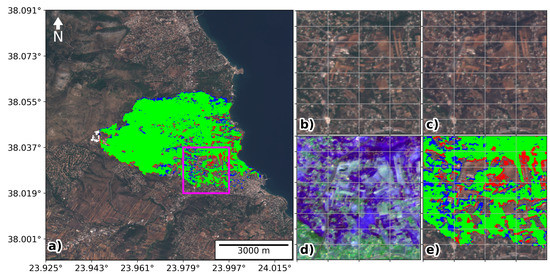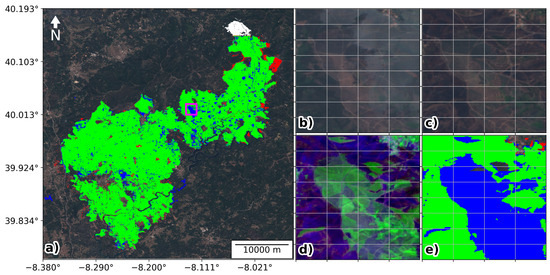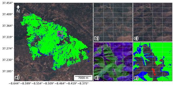 Visual analysis of “Portugal 1” fire. Panel (a) shows the true colour satellite view for the selected fire region together with the burned area maps derived in this study and by CEMS: green represents the pixels where both products agree; red represent burned pixels identified by this study and not by CEMS; blue corresponds to burned pixels identified by CEMS and not in this study; white pixels correspond to burned pixels outside the CEMS mapping window. Panels (b–e) correspond to the zoomed region indicated by the magenta square in panel (a); panels (b,c) represent the true colour view for the median composite before and after the fire, respectively; panels (d,e) show the false colour composite of pre/post-fire differences in red, NIR and SWIR and the zoomed view of panel (a) map, respectively.