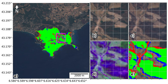 Figure 5a suggests an overall good accuracy, which was confirmed by a Dice score of 0.933 (Table 4, first row). The white patch on the northeast part of the burned area corresponds to a region not mapped by the CEMS and therefore was not considered for the computation of the evaluation metrics. Regarding the large easternmost red patch, we visually confirmed, using the Sentinel-2 data, that it corresponds to a burned region, but it was one of the latest regions to burn, likely after the CEMS analysis data, thus explaining the difference. On the remaining of the burned region (Figure 5a) we see that most differences lay in small patches within the burned region, which CEMS map attributed to burned contrary to our classification. To get some insight, we looked in detail at one of these patches (identified by a magenta square in Figure 5a) in Figure 5 panels (a) to (e). Looking at panels (b) and (c), corresponding to true colour view median composites for the periods before and after the fire, respectively, we see, although not very clearly, that the green regions in panel (e) had a shift in colour from dark green to dark brown. The false colour composite in panel (d) makes it easier to appreciate this difference. Furthermore, we note that the southernmost section of this burned area was mapped with higher detail by CEMS and Figure 5a shows that the agreement between the two maps is stronger thereby suggesting that most of the differences are in part based on the detail of the analysis or the criteria for regions with a low burn severity as we will further discuss later.