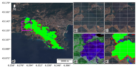 Figure 7 and Figure 8 show the two cases for the French Riviera in July 2017. These two fires represented a total of 489 and 1344 ha of burned area, respectively, and despite being much smaller in size compared to the examples of Portugal, they led to significant socio-economic impacts, forcing the evacuation of more than 10,000 people, according to the local press. The agreement between our product and the CEMS maps was again very good with a Dice coefficient of 0.931 and 0.941 for each case, respectively. The zoomed view in Figure 7 and Figure 8b–e panels shows that the discrepancies between the two maps are mostly in the margins between burned and unburned regions. These small differences are to be expected when comparing products obtained from different satellite sensors, particularly if the raw data have different spatial resolution or view angles.