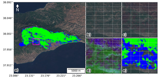 Figure 9 and Figure 10 show the two cases for Attica, Greece in July 2018. The total burned area for these events was 4363 and 1232 ha, respectively. The location of the fires in wildland-urban interfaces together with extreme weather conditions, led to the tragic outcome of 102 fatalities [46]. For these two cases we obtained a Dice coefficient of 0.870 and 0.924, respectively. Starting with the first case (Figure 9) where the discrepancy between our product and the CEMS maps was the largest of all other five case studies considered here, we first note that there is a large blue patch in the western side of the burned area, i.e., a burned scar identified by CEMS maps, contrary to our product. By visually inspecting post-fire Sentinel-2 images we found no evidence for that patch to be burned. It is most likely that this was mis-classified by CEMS due to the presence of clouds in the region as observed in the CEMS data for this case study (see Table 2). Looking now at the zoomed region on Figure 9 panels (b) to (e) we can see that scattered burned patches with sectors that may have burned with a low or negligible severity, since in several parts they still appear in dark green colour in the post-fire true colour composite (panel c). This example illustrates well what we already mentioned in the previous case studies. Looking now at Figure 10 we start by noting that the small white patch on the west side of the burned area is outside the region mapped by CEMS and was therefore not considered to compute the evaluation metrics (Table 4, last row). Focusing now on the zoomed region a high number of small gaps are clearly observed. These correspond to small clusters of houses in the path of the fire and it is therefore a challenging case to map the burned area. We note that for this case the CEMS used data from Pleiades-1A-1B that has a source resolution of 0.5 m. The good agreement between our product and the CEMS is an indication that our methodology can be applied not only for wildland regions but also to more challenging wildland-urban interfaces with as good accuracy, reflecting that the deep learning model described in Section 2.4.2 successfully learned the spectral patterns associated with the burned areas.