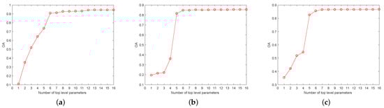 Classification overall accuracy (OA) of artificial neural network (ANN) with increasing parameter subset (a) Flevoland, (b) Oberpfaffenhofen, and (c) Xi’an.