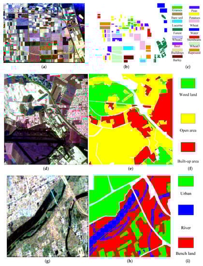 Three fully polarimetric images. (a) PauliRGB image of Flevoland, (b) ground-truth map with (c) legend; (d) PauliRGB image of Oberpfaffenhofen, (e) ground-truth map with (f) legend; and (g) PauliRGB image of Xi’an area, (h) ground-truth map with (i) legend.