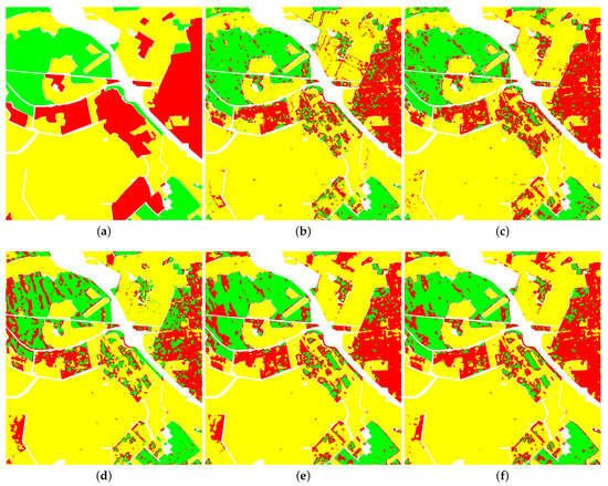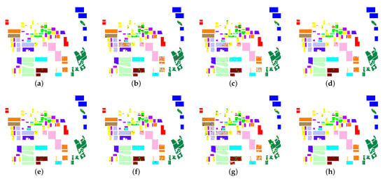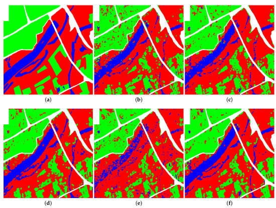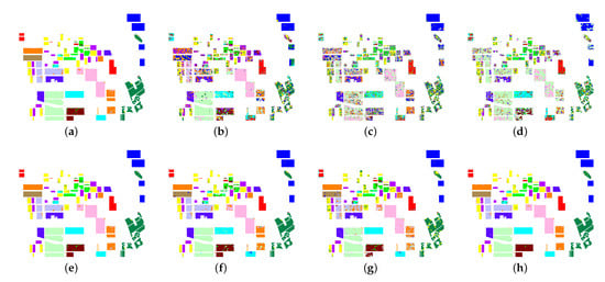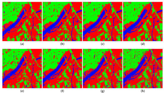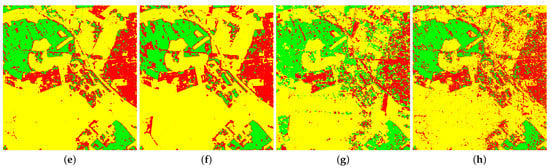 Figure 3 shows the classification results of the ground-truth map of the Flevoland image obtained by the four classifiers on the original Touzi decomposition parameters and the normalized parameters. According to the known labeled blocks in the ground-truth map, it is clear that there is almost no difference between the classification results of Figure 3a,e. This illustrates that the proposed normalization method of input parameters has little effect on the classification results of SVM. Compared with the result images of the other three classifiers, it is easy to find that the classification effect of the blocks in Figure 3f–h is much better than that of the corresponding regions in Figure 3b–d. The above analysis shows that for the ANN-based classifiers, the proposed normalization method of the parameter of Touzi decomposition is effective and can improve the classification performance to some extent. Consequently, the subjective analysis of visual effect verifies the correctness of the objective indicators in Table 8 above.