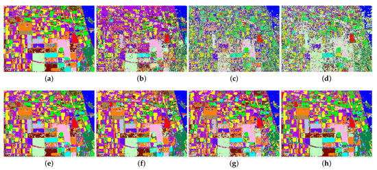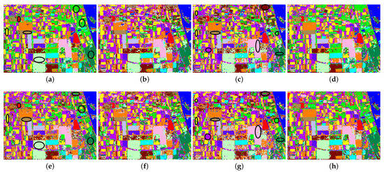 Classification result of the ground-truth map of Flevoland image obtained by four classifiers on different forms of Touzi decomposition parameters, including (a) SVM on original parameters, (b) ANN on original parameters, (c) autoencoder (AE) on original parameters, (d) classifier based on AE (AEFT) on original parameters, (e) SVM on normalized parameters, (f) ANN on normalized parameters, (g) AE on normalized parameters, and (h) AEFT on normalized parameters.