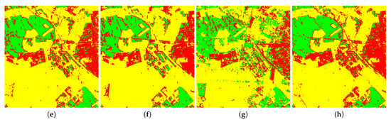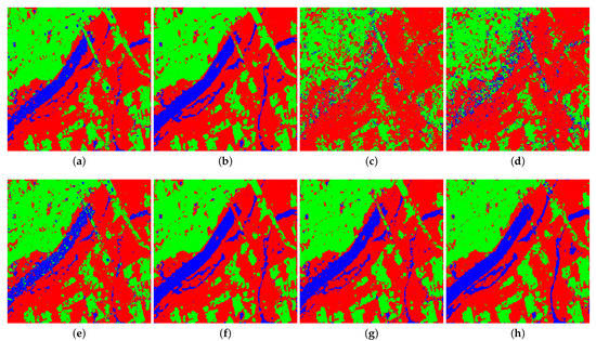 Prediction result of Oberpfaffenhofen image obtained by four classifiers on different forms of Touzi decomposition parameters, including (a) SVM on original parameters, (b) SVM on normalized parameters, (c) ANN on original parameters, (d) ANN on normalized parameters, (e) AE on original parameters, (f) AE on normalized parameters, (g) AEFT on original parameters, and (h) AEFT on normalized parameters.