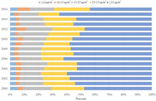 With reference to the criterion value for the annual average concentration of PM2.5, the target values for the three stages of a transition period, and the Chinese ambient air quality standards (GB3095-2012) set in the Air Quality Guidelines issued by the World Health Organization (WHO) in 2005, the annual average PM2.5 is divided into five grades of <10 μg/m3, 10–15 μg/m3, 15–25 μg/m3, 25–35 μg/m3, >35 μg/m3. According to PM2.5 classification rules, the PM2.5 concentration values are classified and calculated to obtain the proportion of cities in different grades of PM2.5 values, as shown in Figure 1. From 2000 to 2016, the proportion of cities with an annual average PM2.5 concentration of less than 10 μg/m3 (criterion value) was 2.43–5.12%. The proportion of cities with an average yearly PM2.5 concentration between 10 and 15 μg/m3 (IT-3: the annual average limit of target 3 in WHO transition period) was 3.77–8.63%. The proportion of cities with an average yearly PM2.5 concentration between 15 μg/m3 and 25 μg/m3 (IT-2: the annual average limit of target 2 in WHO transition period) was 17.25–20.22%. The proportion of cities with an average yearly PM2.5 concentration between 25 μg/m3 and 35 μg/m3 (IT-1: the annual average limit of target 1 in WHO transition period) was 23.18–25.34%. The proportion of cities with an annual average PM2.5 concentration greater than 35 μg/m3 was 43.40–47.71%. The analysis showed that China’s PM2.5 governance had achieved certain results, but further efforts are needed to reduce PM2.5 pollution and achieve sustainable development goals by 2035.