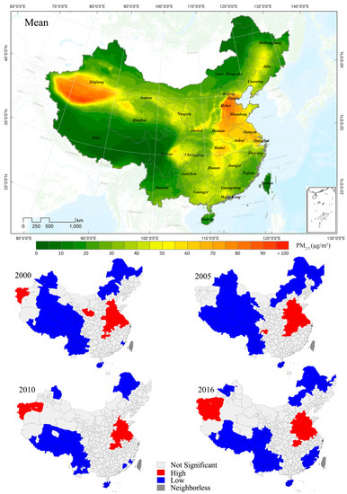 Mean spatial pattern and clustering of PM2.5 in China during 2000–2016.