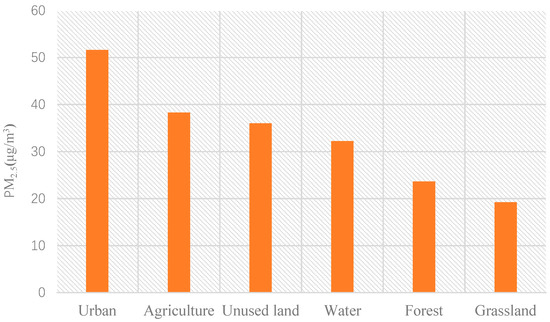 It is found that PM2.5 was positively correlated with urban land, farmland, and water bodies, and the correlation coefficients were 0.34 (p = 0.01), 0.047 (p = 0.01), and 0.067 (p = 0.01), respectively. PM2.5 was negatively correlated with forest land, grassland and unused land, and the correlation coefficients were −0.438 (p = 0.01), −0.265 (p = 0.01) and −0.441 (p = 0.01) respectively. Land use data were resampled to make its spatial resolution consistent with the grid PM2.5 data. Then, the mean concentration of PM2.5 on different land types was calculated by using the resampled land use data of 2016. As shown in Figure 3, the average PM2.5 concentrations show the highest values for urban land and decrease in the order of farmland > unused land > water body > forest > grassland. Because the unused land includes sandy land, dust in the desert is the cause of high PM2.5 concentrations. The highest value being under urban land indicates the city as a major source area of PM2.5 in China.