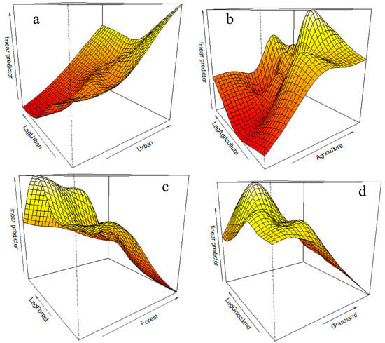 Three-dimensional effect graph of land use on the variation of PM2.5 concentration. (a) urban; (b) agriculture; (c) forest; (d) grassland.
