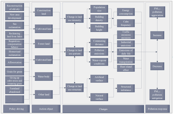As shown in Figure 5, as the main driver for air pollution, different land use types, patterns, and development intensities will obviously result in different distribution patterns of PM2.5 pollution [64,65,66,67]. In fact, the expansion of urban scale and the increase in urban land area will lead to the imbalance of artificial and natural surface structures. In the process of this change, the land pattern has also changed. The construction of new residential areas, commercial areas, or industrial parks has improved the population density and commuting distance, thus increasing pollution emission sources. Changes in cities’ landscape pattern structure have also changed the microclimate environment, which is prone to the heat island effect and increased water evapotranspiration [68]. In addition, the increase in land use and development intensity, building density, and height enable cities to accommodate more people. Still, it also increases the urban energy consumption, and the buildings are built higher and higher in the city. The effect of blocking and friction makes the wind flow through the city significantly weaker, thereby exacerbating PM2.5 pollution [69]. On the contrary, the reasonable optimization of the land structure, distribution pattern, and development intensity can alleviate PM2.5 pollution in the process of urban expansion.